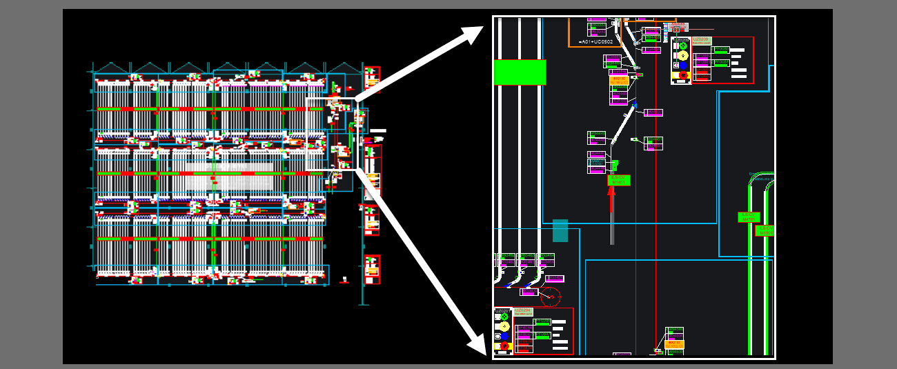 Extraction of equipment positions and all necessary cable lengths from DXF layouts. Created through pathfinding and automatic generation of optimal cabling.