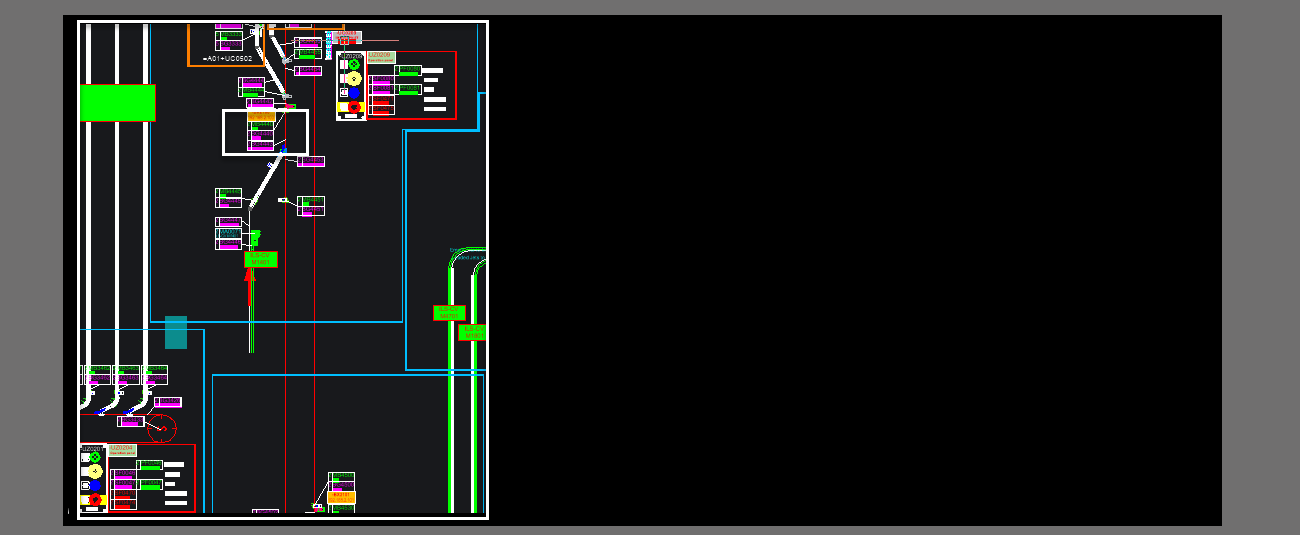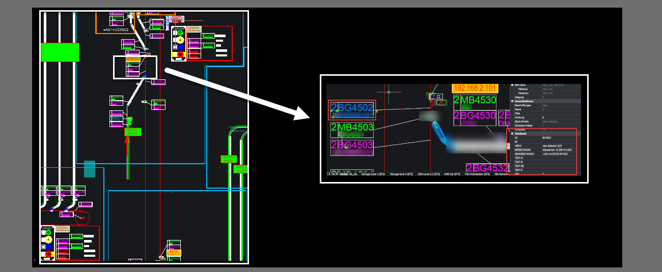 The cable evaluation is based on a DXF file created by the automation department to represent the layout. The challenge was reliably detecting components such as actuators, control cabinets, and sensors and identifying their logical connections via polyline paths. A robust parsing logic was developed using defined symbols and geometric relationships to interpret the cabling and automatically generate cable lists.