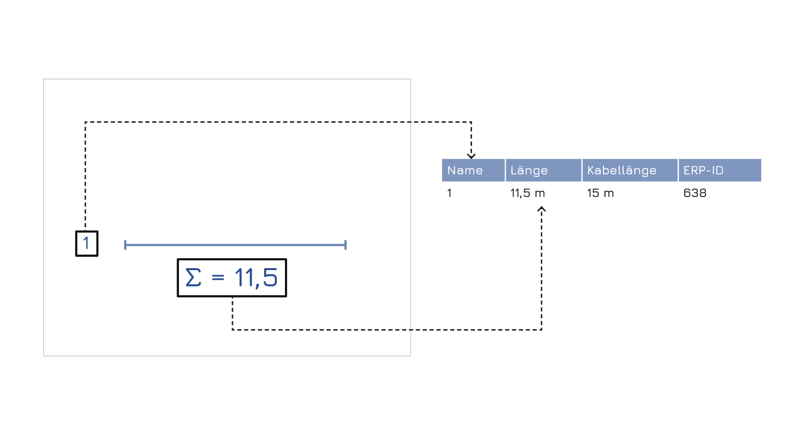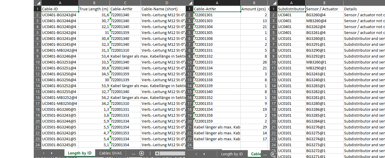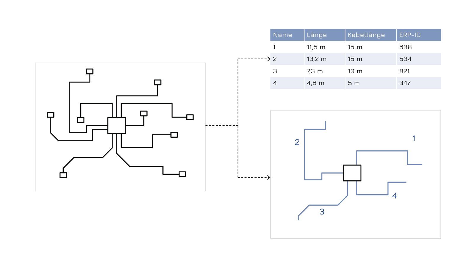 The cabling of large industrial plants is a complex process, as thousands of components are managed in a model. After completion of the planning, a parts list of all required sensors, actuators and cables must be derived from this layout. The necessary cable path must be determined and recorded in a list for each one. In the end, there is a list of the number of all required cables with the correct lengths, properly labeled and prepared for the construction site. All these steps were determined by measuring the line lengths in the CAD model and the positions of the associated sub-distributors or control cabinets.