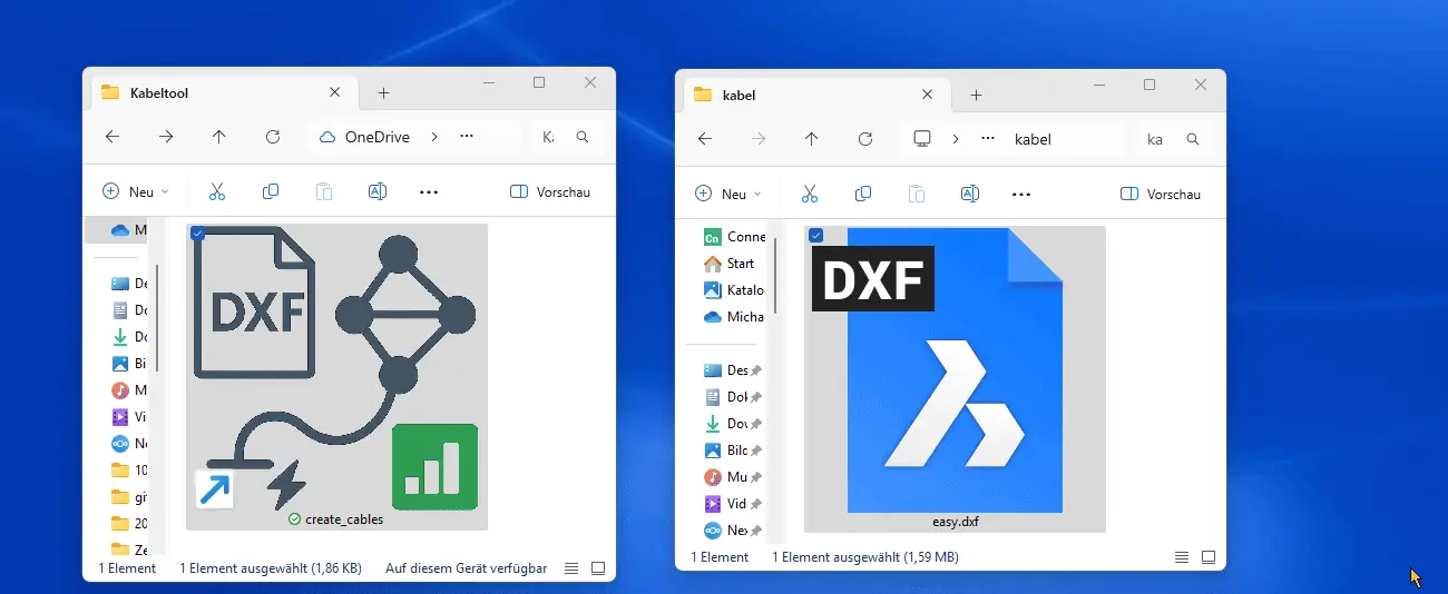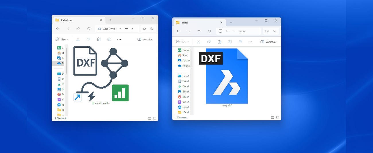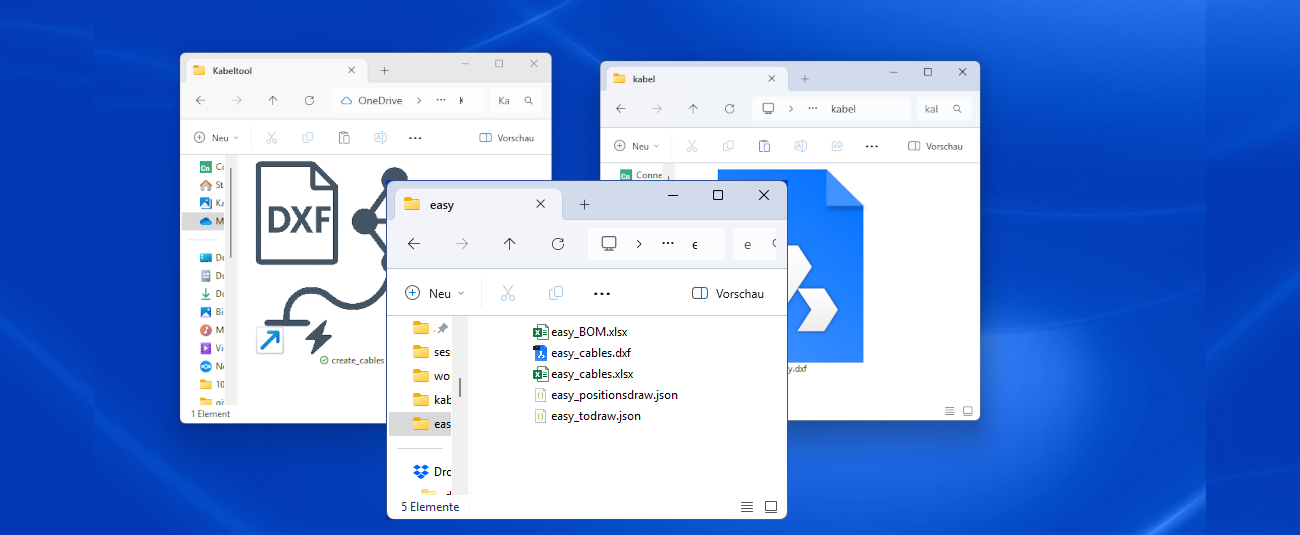 The tool reads DXF files, calculates cable routes automatically, and delivers Excel lists and DXF files with the cable paths for direct use. All processes are automated without user input.